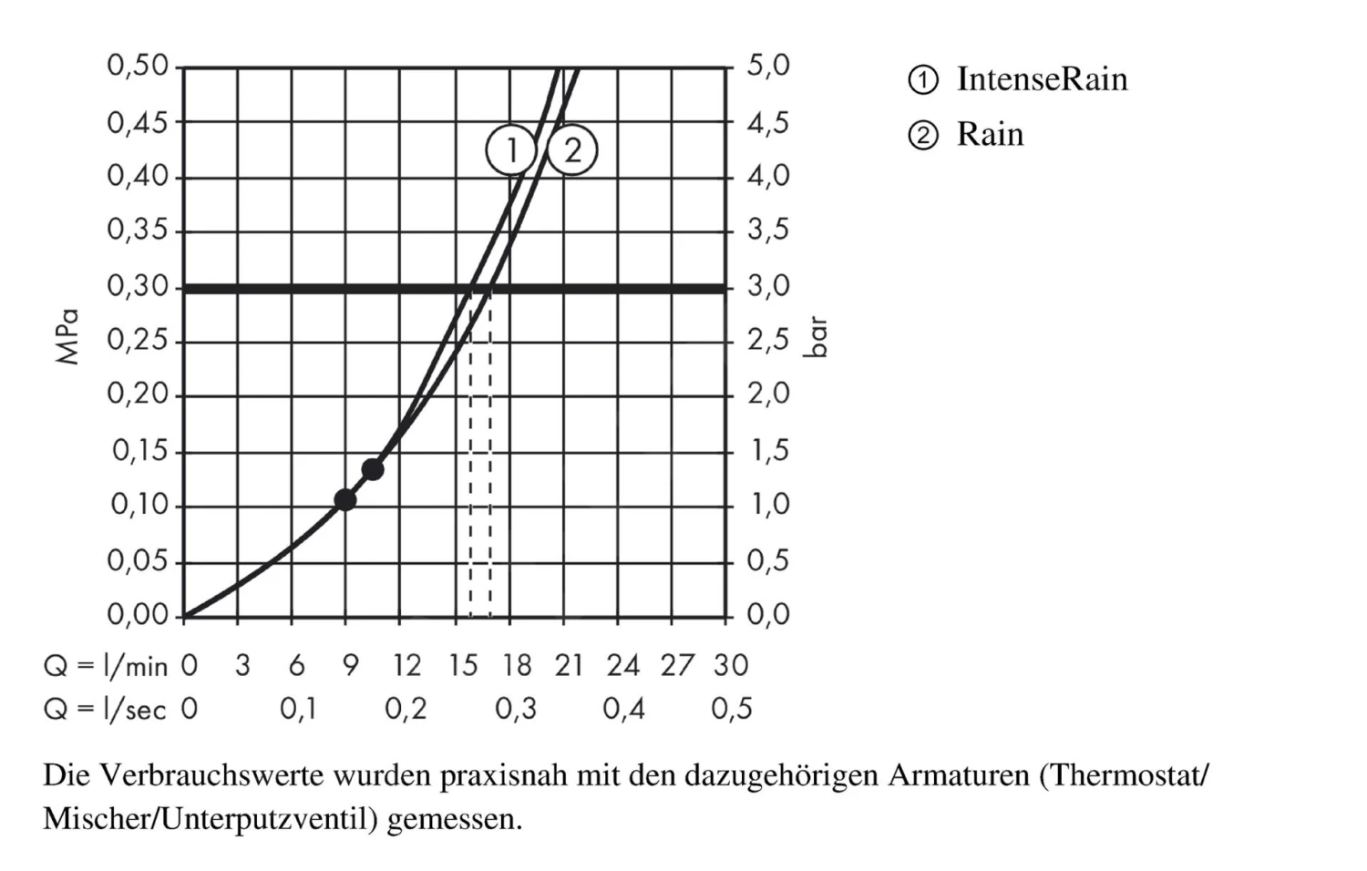 - Durchflussmenge IntenseRain Strahl (bei 3 bar): 16 l/min
