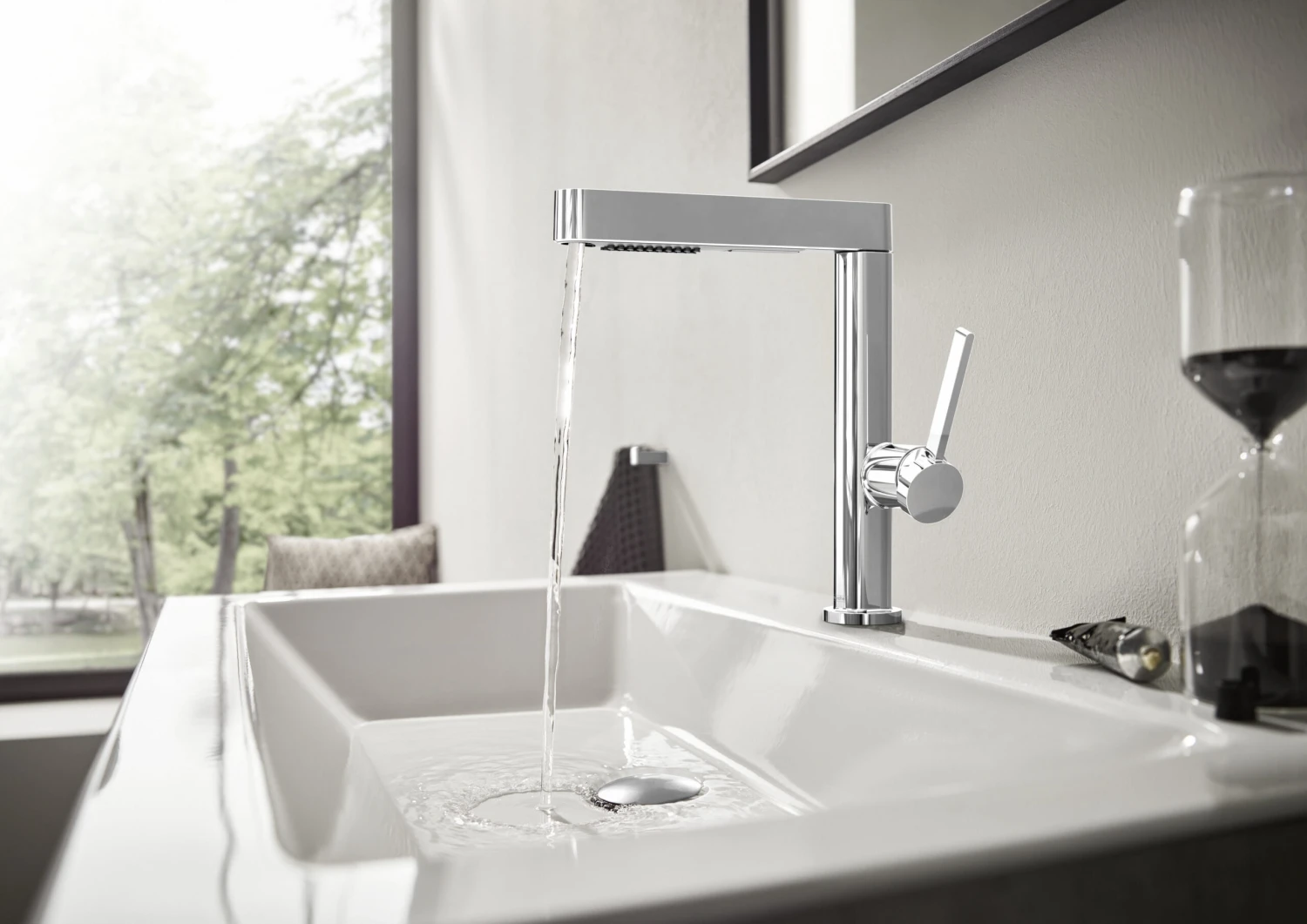 - Strahlumstellung durch Tastendruck und Strahlrückstellung automatisch durch Schließen der Armatur