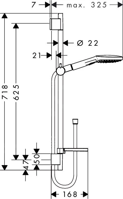 - Besteht aus: Handbrause, Brausestange, Brauseschlauch, Schieber, Seifenschale